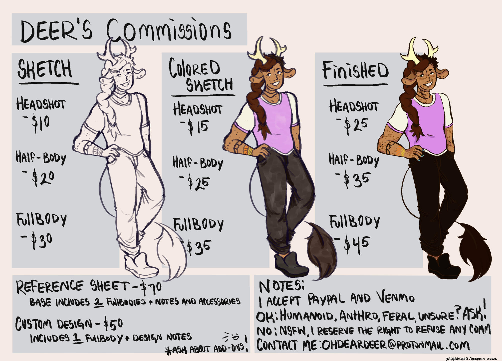 -Payment is required before I begin, refunds are available anytime before I finish. (Traditional refunds, before the linework is finished)-I will send you updates throughout the process to make sure the piece best reflects your character :)-Pieces will take 1-2 weeks, but most likely less. Feel free to contact me at any point in that time-Each additional figure is plus 80% of the main price. For example, two finished fullbodies would be: 45+36 = 81-I also do traditional comms! They are priced slightly higher to account for shipping and come with an optional laminating service for no extra charge!-I don't usually draw backgrounds, but if you'd like one we can work something out. Cost will depend on the complexity of the scene. Please know I will not do excessively detailed backgrounds.-My ref sheets usually follow the same layout, if you'd like a different arrangement, color, or aesthetic let me know! Please note that some features, such as multiple outfit references, will cost extra.Please Contact me if you have any questions! I have social medias linked below